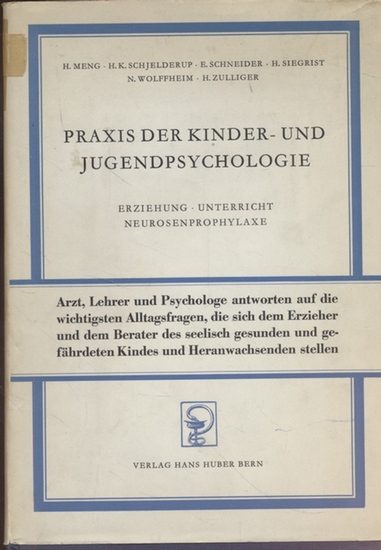 "Praxis der Kinder- und Jugendpsychologie: Erziehung - Unterricht - Neurosenprophylaxe." "Hans Huber Verlag Berlin, 1951.". "215 S. Leineneinband mit Schutzumschlag.". "Schutzumschlag berieben und leicht beschädigt, Papier altersbedingt gebräunt, Stempel der Vorbesitzer in Vorsatz und auf Seiten im Buch, sonst guter Zustand ohne Anstreichungen. - Inhaltsverzeichnis - Inhaltsverzeichnis - Vom Sinn und Ziel der «Praxis der Kinder- und Jugendpsychologie», von Prof. Dr. med. Heinrich Meng, Dozent für Psychohygiene an der Universität Basel - i.Psychologische und pädagogische Erörterungen zum Problem des Schuleintrittes und der ABC-Schützen, von Hans Zulliger, Oberlehrer, Ittigen/Bern - 2.Neurose und Erziehung. Prof. Dr. Harald K. Schjelderup, Oslo, o. ö. Professor und Leiter des Psychologischen Instituts an der Universität Oslo - 5.Das Schulkind und seine Umweltbeziehungen, f Hans Siegrist, Bezirkslehrer, Baden (Aargau) - 4.Geistige Hygiene im Erziehen und Unterrichten. Prof. Dr. med. Heinrich Meng, Dozent für Psychohygiene an der Universität Basel - 5.Freud zur Kinderpsychologie. Nelly Wolff heim, Psychologin, Oxford (G.B.) - 6.Schwererziehbarkeit in der Pubertät als Problem der Schule, f Hans Siegrist, Bezirkslehrer, Baden (Aargau) - 7.Schund-Phantasie und Angstbewältigung. Hans Zulliger, Oberlehrer, Ittigen/Bern - 8.Wir prüfen, ob die Entwicklung unserer Kinder in Ordnung verläuft Prof. Dr. phil. Ernst Schneider, Psychologe, Basel - 9.Nachweis der Quellen aus S. Freuds «Gesammelten Werken», zusammengestellt von Nelly Wolffheim - 10.Neue Reihe der Bücher des Werdenden - 11.Paul Federn 1871-1950. ".