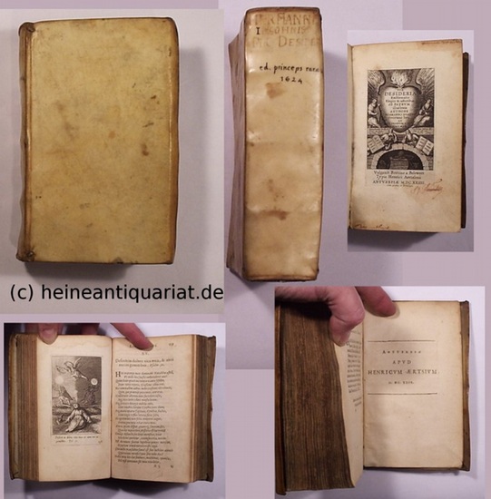 Emblem* - Pia desideria : emblematis elegiis & affectibus ss. patrum illustrata authore Hermanno Hugone. Antverpiae Boetius a Bolswert , Aertsius 1624. 15 Bll; 412 S; 2 Bll; 3(w) Bll., Pergamentbd.d.Zt. Kl.-8°. Dekorativer Pergamentband der Zeit mit handschriftlichem Rückentitel, später in Tinte ergänzt ("ed. princeps rara 1624". Der Band mit Alters- und Gebrauchsspuren, Schnitt stark gebräunt, der Band insgesamt etwas verzogen. Innen mit vereinzelten Wasserrändern, teils bis an die Darstellungen. Mehrere handschriftliche Besitzvermerke auf dem Titelkupfer. Vollständig, sämtliche Illustrationen vorhanden (numeriert von 0-45, sowie 1 gest. Vortitel und ein ganzs. gest. Wappen, insges. also 48 gest. Embleme, meist mit lateinischen Devisen, 1-45 mitpaginiert.) Häufig aufgelegt, hier allerdings die erste Auflage. (Emblem; Emblembuch; Emblembücher; Emblemes; Emblematik; christliche Symbolik).