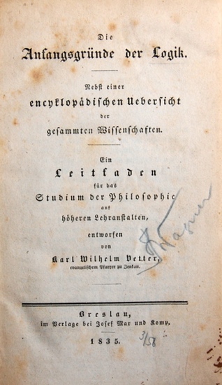 Die Anfangsgründe der Logik. Nebst einer encyklopädischen Uebersicht der gesammten Wissenschaften. Ein Leitfaden für das Studium der Philosophie auf höheren Lehranstalten. Breslau, Jsef Max und Komp., 1835. Halbleinen, XII,173 Seiten. In Frakturschrift. Einband berieben, Rücken oben leicht beschädigt, Vor- und Nachsatz sowie fliegendes Vor- und Nachsatzpapier leimschattig, Besitzervermerk auf Vorsatz, Seiten stockfleckig, einige Seiten mit braunen Flecken (Tinte?), Seite XII am Rand verschmutzt. 1. Aufl.