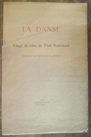 La Danse. Vingt dessins de Paul Renouard. Transposes en harmonies de couleurs. [ Tanz. Zwanzig Zeichnungen. Umgesetzt in die Harmonie der Farben.] Paris. Charles Gillot. 1892. In folio, 52 x 37 cm. Deux pages de titre et de matieres de tables, la troisieme page avec avis des editeurs Charles Gillot et Theodore Child. 20 pl.en couleurs montees (26 x 20 cm.) sur papier de Chine, l?ensemble dans une enveloppe de papier brune, avec des dechirures et quelques froissures, part. reparees. La cartonnage un peu brunie aux bords, la page de titre reparee avec ruban adhesive resistant, mais avec une dechirure de 15 cm. Les pl. 12, 13 et 20 avec une dechirure de 2 cm, mais les pl. memes belles et propres. L'edition est de 275 expl. sur papier de Chine, num. de 1 a 275 et de vingt expl. sur papier de Japon, num. I - XX, le notre avec no. 234. Paul Renouard, artiste francais, influence par Degas et Manet, disciple de Isidore Pils en 1868 et un des decorateurs a l'Opera de Paris. Premiere exhibition au Salon de 1877. Les litographies en couleurs de "La Danse" sont produits en collaboration avec l'imprimeur Charles Gillot, qui a transforme les dessins en b/n de Renouard en couleurs avec un proces special, patente "Gillotage", l'ensemble en consultation avev Renouard, ceci influence aussi par Whistler. -- Folio. 52x37cm. Titelblatt, Inhaltsblatt, dritte Seite mit Mitteilung der Herausgeber Charles Gillot und Theodore Child. Komplett mit allen 20 montierten Farblithographien (26x20cm) auf Chinapapier in einfachem, braunen bedruckten Papierumschlag. Das Titelblatt mit einem mit säurefreiem Filmoplast hinterlegten ca. 15 cm langen Einriss. Das Blatt mit der Tafelaufzählung wurde wohl nachträglich schief (ca. 1 cm) am Innenrand beschnitten. Der Papierumschlag im Randbereich und Rücken mit bis zu 8cm langen, teils fachgerecht hinterlegten Einrissen sowie Knickspuren. Die Kartons sind wenig randgebräunt, selten mit Fingerfleck im Randbereich, die Nummern 12 und 13 mit ca. 2 cm Einriss am oberen Rand, Nr. 20 am linken Seitenrand. Die Grafiken selbst sind schön sauber. L?edition est de 275 (295) expl., le notre avec no. 234. -- Die Auflage betrug 275 Expl. auf Chinapapier, numeriert von 1 - 275 und 20 Expl. auf Japanpapier, num. I-XX, unser Expl. hat die Nr. 234. -- Charles Renouard, französ. Künstler, beeinflußt von Degas und Manet, war 1868 Schüler von Isidore Pils und hat an der Ausgestaltung der Pariser Oper mitgewirkt. 1877 seine erste Ausstellung im Salon. Charles Gillot hat in einem speziellen, von ihm erfundenen und patentierten Verfahren, der "Gillotage", die schwarz-weiss Zeicnungen Renouards mit dessen Konsultation in von Whistler beeinflusste Farblitographien umgewandelt. GM26-305302.