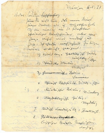Eigenh. Brief mit U. München, 16. V. 1927. 2 SS. Folio. Liste von Zeitschriften.