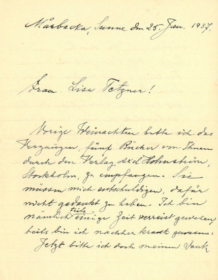 Brief mit eigenh. U. Mårbacka, 25. I. 1937. 1? SS. auf Doppelblatt. 8vo. An die Schriftstellerin Lisa Tetzner (1894-1963): "Vorige Weihnachten hatte ich das Vergnügen, fünf Bücher von Ihnen durch den Verlag Axel Holmström, Stockholm, zu empfangen. Sie müssen mich entschuldigen, dafür nicht gedankt zu haben. Ich bin nämlich teils einige Zeit verreist gewesen, teils bin ich nachher krank gewesen. Jetzt bitte ich doch meinen Dank aussprechen zu dürfen [...]".