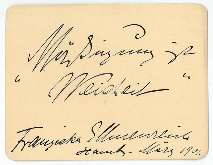 Eigenh. Widmung mit U. Hamburg, März 1901. 1 S. Qu.-8vo. "Mäßigung ist Weisheit". - Nachdem die Tochter des Sängers Albert Ellmenreich (1816-1905) 1862 in Meiningen debütiert hatte, kam sie über Mainz und Kassel nach Hannover, wo sie Marie Seebach (1829-1897) im Fach der Liebhaberin und Heroine ablöste. 1880 bei den Münchner Musteraufführungen ihren künstlerischen Ruf begründend, führten Gastspiele sie nach London und in die USA, nach Hamburg, Berlin und Wien. 1901 war sie Mitgründerin des Hamburger Schauspielhauses und gehörte bis 1912 dem Ensemble des Hauses an.
