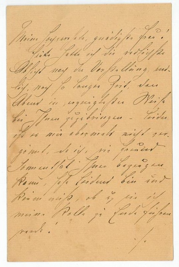 Eigenh. Brief mit U. [Wohl Wien], 7. III. 1888. 1 ? SS. auf Doppelblatt. 8vo. An eine namentlich nicht genannte Adressatin: "Heute hatte ich die redlichste Absicht nach der Vorstellung endlich, nach so langer Zeit, den Abend [?] bei Ihnen zuzubringen - leider ist es mir abermals nicht vergönnt, da ich, wie Freund Sonnenthal Ihnen bezeugen kann, sehr leidend bin und kaum weiß, ob u. wie ich meine Rolle zu Ende führen werde [?]". - Robert Emerich debütierte 1865 am Zürcher Aktientheater, kam 1866 an das Stuttgarter Hoftheater und 1868 an das Kgl. Schauspielhaus Berlin, dessen Mitglied er wurde. 1872 folgte er der Berufung Heinrich Laubes an das neu gegründete Wiener Stadttheater, verließ diese Bühne gemeinsam mit Laube 1874 und unternahm Gastspielreisen. 1875-78 trat er zeitweise wieder am Stadttheater in Wien auf und wechselte 1878 an das Burgtheater, dem er bis zuletzt angehörte.