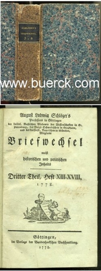 Briefwechsel meist historischen und politischen Inhaltes. Dritter Theil, Heft XIII-XVIII und vierter Theil, Heft XIX-XXIV (in einem Band). Göttingen: Vandenhoek. 1778-1779. (etwas beschabt und bestossen, kleine Fehlstelle am oberen Kapital, nahezu ausgeblichener Besitzvermerk auf der Titelei, leicht gebräunt und braunfleckig, insgesamt recht gut erhalten). Erste Ausgaben dieser Zeitschrift (der Titel >Briefwechsel< ist etwas irreführend) mit Beiträgen zu Geschichte, Geographie, Ökonomie u.a. Schlözer (1735 - 1809) hatte zahlreiche Fächer studiert, darunter Geographie, orientalische Sprachen, Medizin und Staatswissenschaften. Vom 1761 bis 1770 lehrte er in Rußland, u.a. an der Kaiserlichen Akademie der Wissenschaften. Für seine Verdienste um die Erforschung der russischen Geschichte wurde er von Kaiser Alexander I. in den Adelsstand erhoben. Schlözer wechselte später an die philosophische Fakultät der Universität Gießen, an der er jahrzehntelang Geschichte, Statistik, Politik und Staatsrecht lehrte. In seinen zahlreichen Schriften, darunter Zeitschriften wie die hier angebotene, wirke er in aufklärerischem Sinne und wurde zu einer - auch gefürchteten - politischen Macht. Zu seinen Schülern, die sich von ihm nachhaltig beeinflußt zeigten, gehörten u.a. die preußischen Reformer Freiherr vom Stein und K.A. von Hardenberg. Schlözer ist auch Schöpfer des Begriffs "Justizmord".