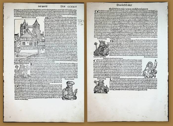 WELTCHRONIK Blatt, Leaf: CCXXIII [223] recto: Johanniterorden Rhodos; Johann von B?hmen (=Jang de Blannen = Jean de Luxembourg) (1296-1346); Dante Alighieri (1265-1321) verso: Robert von Anjou K?nig von Neapel (=Roberto d'Angi?) (1278-1343) ? Famiele Scaliger ? famiglia Della Scala?; Ludwig X. K?nig von Frankreich. (=Ludwig X. der Z?nker = Louis X le Hutin (1289-1316). N?rnberg, Druck: Anton Koberger, 1493. ganze Buchseite, Einzelblatt, Leaf, Format ca.: 41x29 cm, mit Marginalie von alter Hand. original Holzschnitt, original Woodcut, Deutsche Ausgabe, German edition, Liber chronicarum N?rnbergische Chronik Das Buch der Chroniken, Schedelsche Weltchronik, Michael Wolgemut, Wilhelm Pleydenwurff, Hartmann Schedel, Ikunabelblatt , Icunable leaf.