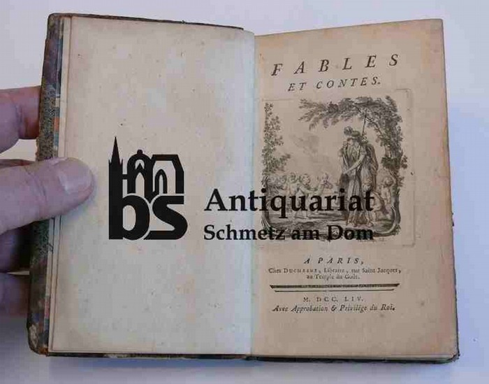 Fables et Contes. Mit einer gr. gestoch. Titelvignette und 3 Textvignetten nach Eisen von Aliamet, Pitre-Martenasie und Sornique. Paris, Duchesne 1754. Kl.-8°. LXVIII, 129 S., [8] Bll. (das letzte leer). Halbleder der Zeit mit etwas Rückenvergoldung, Buntpapier-Vorsätze. Insgesamt etwas berieben, die Kanten auch stärker. Name am ersten - sonst leeren - Blatt. Geringf. gebräunt und geringf. gelockert. Barbier II.414. Cohen/De Ricci Sp. 182 und Cioranesco 13457 (jeweils unter Boulanger, bzw. Boulenger de Rivery). Übersetzung und umfangreiche Einleitung von Boulanger de Rivery. Die Bibliographien geben als Format Duodez an, nach Bogenzählung handelt es sich aber um (Klein)-8°.