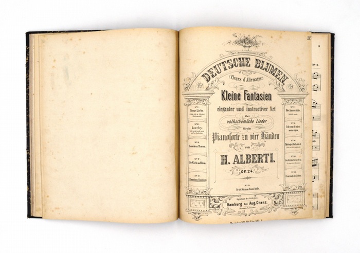 Kleine Fantasien eleganter und instructiver Art über volksthümliche Lieder für das Pianoforte zu vier Händen. Op. 24. No. 1-11 (Elf Teile in einem Band). Angebunden: Diverse Notendrucke für Pianoforte (F. X. Chwatal, Ferd. Beyer, u.a.) Hamburg, Aug. Cranz, ca. 1850. 4°. Notendrucke mit mit lithogr. Titelblättern. (= Deutsche Blumen, Fleurs d'Allemagne), Op. 24 besteht aus 11 Nummern: 1. Treue Liebe. 2. Die Auserwählte. 3. Loreley. 4. Ach wenn du wärst mein eigen. 5. Aennchen v. Tharau. 6. Thüringer Volkslied. 7. Die Wacht am Rhein. 8. Der Wirthin Töchterlein. 9. O Tannenbaum, o Tannenbaum. 10. Freut euch des Lebens. Einband bestoßen. Einige Notenblätterrückseiten mit Bleistiftgekritzel bzw. stockfleckig.