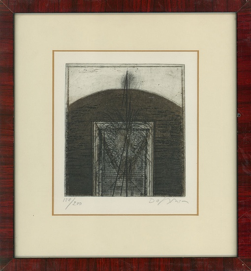 Abstrakte Komposition. [Signierte Original-Farbradierung, gerahmt / signed original color etching, framed]. _. Karl Fred Dahmen, geboren am 4. November 1917 in Stolberg, gestorben am 12. Januar 1981 in Preinersdorf am Chiemsee. Nummer 158 von 200 nummerierten Original-Farbradierungen auf Büttenpapier, von Karl Fred Dahmen unterhalb der Abbildung in Blei signiert. Fachmännisch gerahmt im Holzrahmen. Nicht ausgerahmt. Maße Abbildung: 14,5 x 13,5 cm. Maße Rahmen: 30,0 x 27,5 cm. Rahmen mit leichten Gebrauchsspuren, berieben, bestoßen. Insgesamt sehr gutes Exemplar. Number 158 of 200 numbered original color etchings on handmade paper, signed in lead by Karl Fred Dahmen below the image. Professionally framed in a wooden frame. Not examined out of frame. Dimensions illustration: 14.5 x 13.5 cm. Dimensions frame: 30.0 x 27.5 cm. Frame with slight signs of wear, rubbed, bumped. Overall very good copy.