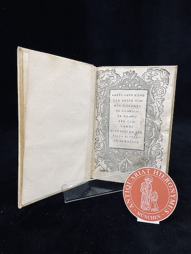 Ameto over Comedia delle Nimphe Fiorentine compilata da messer Giovanni Boccacci di Certaldo cittadino di Firenze. Venedig, Nicolo Zopino e Vicentio compagno, 1524. 12° (15-18,5 cm). 95 num. Bll. Pergament der Zeit. Gut Titelblatt aufgezogen und etwas fleckig, Seiten gering gebräunt, ansonsten gut erhalten. Ohne die letzte Vakatseite. Adams B-2126. Frühe und schöne Ausgabe des berühmten Hirtenromans des Renaissancedichters Giovanni Boccaccio über den zivilisatorischen Einfluss der Liebe. Boccaccio schrieb dieses Werk in den Jahren 1341/42 in Florenz, als er seinen kranken Vater pflegte und von seiner Geliebten in Neapel getrennt war. Es gilt als Anregung für viele spätere Hirtenromane und Pastorale. Mit ornamentaler Holzschnitt-Titelrahmung im Stil der Renaisssance und interessanter Vignette auf der letzten Seite, welche die Legende der Mitgiftspende des Heilgen Nikolaus von Myra zeigt.