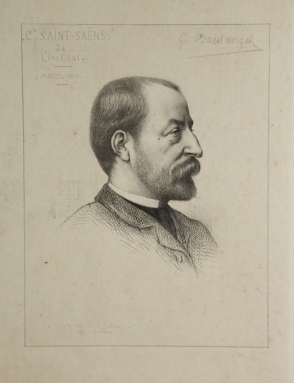 Portrait des Komponisten Charles-Camille Saint-Saëns. Brustfigur im Profil nach rechts. Radierung von Charles Bellan nach der Zeichnung von Gustave Baulanger, 1884. Format (Bildbereich): 16,5 x 12,5 cm. Blattgröße: 28 x 20,5 cm. *Camille Saint-Saëns (1835-1921) war ein französischer Pianist, Dirigent, Organist, Musikwissenschaftler, Musikpädagoge und Komponist der Romantik. Er wurde vor allem durch seine ?große zoologische Fantasie? Karneval der Tiere und die Oper Samson et Dalila bekannt.
