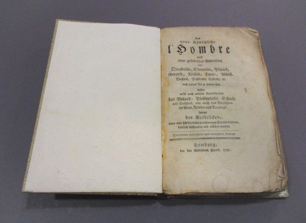 Das neue königliche l`Hombre, nebst einer gründlichen Anweisung wie Quadrille, Cinquille, Piquet, Reversy, Trisett, Taroc, Whist, Boston, Patience, Cabale, &c. nach jetziger Art zu spielen sind. 13. verb. und verm. Aufl. Hamburg, Herold, 1791. VIII, 312 S. 8°. Mod. Pp. Öfters aufgelegtes Handbuch zu verschiedenen kartenspielen des 18. Jahrhunderts wie L`Hobre, Whist, Quadrille, Piquet usw. - "Wobey nebst noch andern Kartenspielen das Billard- Pielkentafel- Schach- und Ballspiel, wie auch das Verkehren im Brett, Trictrac und Toccategli sammt den Ausdrücken, deren man sich bey diesen verschiedenen Spielen bedienet, deutlich beschrieben und erkläret werden". - Etw. gebräunt und fleckig. Unbeschnitten, vereinzelte kl. Randläsuren (ohne Textberührung).