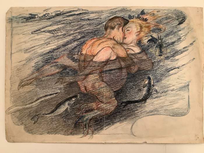 Meerjungfrau beim Liebespiel im Wasser. O.O., ca. 1920. 29,5 : 42,5 cm. Farbige Kreidezeichnung auf Aquarellpapie.r. Mit geglättetem Mittelfalz, Ränder vereinzelt mit winzigen Einrissen.
