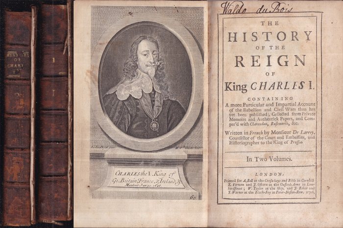 The history of the reign of King Charles I. Containing A more Particular and Impartial Account of the Rebellion and Civil Wars than has yet been published; Collected from Private Memoirs and Authentick Papers, and Compar'd with Clarendon, Rushworth, &c. Written in French by Monsieur de Larrey, Counsellor of the Court and Embassies, and Historiographer to the King of Prussia. Volume I of II. London, Printed for A. Bell at the Cross-Keys and Bible in Cornhill T. Varnam and J. Osborn at the Oxford-Arms in Lombardstreet; W. Taylor at the Ship, and J. Baker and T. Warner at the Black-Boy in Pater-Noster-Row, 1716. 8°, Ganzledereinbd., VIII, 360 S. / 380 S. - Einbände berieben, Rücken schadhaft, ein Einbanddeckel lose, Ex Libris, Namenseintrag, etwas nachgedunkelt und braunfleckig, sonst innen gut erhaltene Exemplare der raren Publikation.
