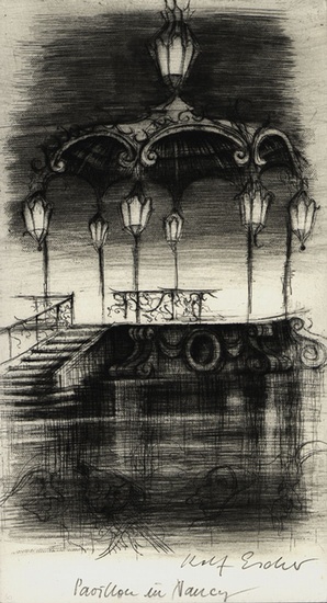 Pavillion in Nancy. [1993]. [Signierte Original-Radierung / signed original etching]. _. (Rolf Escher, geboren 1936 in Hagen. Studium 1956 bis 1962 an der Kunstakademie Düsseldorf). Original-Radierung, Kaltnadel, von Rolf Escher, am unteren Rand mit Bleistift signiert und bezeichnet. Blattgröße: 22,4 x 12,3 cm. Maße Druckplatte: 21,0 x 12,3 cm. Sehr guter Zustand. Original etching by Rolf Escher, signed and titled with pencil below the picture. Sheet size: 22.4 x 12.3 cm. Dimensions printing plate: 21.0 x 12.3 cm. Very good condition.