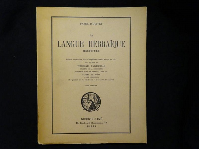 La Langue hebraique restituee. Edition augmentee d`un complement inedit redige en 1823 sous le titre de Theodoxie universelle, examens de la cosmogonie contenue dans le Premier Livre du Sepher de Moise appele Beraeshith et reproduit en fac-simile sur le manuscrit de l`auteur. Paris, Dorbon-Aine [1931]. "4°. XLVIII, 197, 138; 348 (32) S. Okart., etwas gebräunt." "Vgl. Freimann 82 (Ausgabe 1815). Der photomechanische Nachdruck der 1. Ausgabe von 1815; enthält eine weitere Schrift des Verfassers, in welcher er sein Werk ergänzt und verteidigt.".