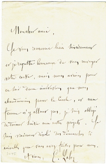 Eigenh. Brief mit Unterschrift. o. O. u. D. 8vo. 1 p. Doppelblatt. An einen namentlich nicht genannten Empfänger wegen einer Einladung, die er leider ablehnen müsse, da er schon zwei Einladungen besitzt.