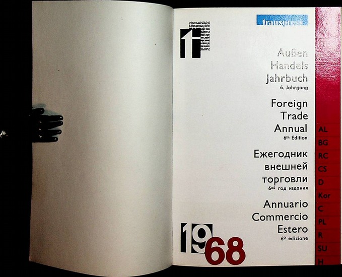 Erscheinungsverlauf: 1. Jg. F?r 1963 erschien 1962) 6. Jahrgang 1968 erschien 1967/ danach eingestellt // Au?enhandelskalender (1965-67: Au?en-Handels-Jahrbuch mit Kalender; 1968: Au?enhandels-Jahrbuch. Foreign Trade Annual. Ezegodnik vnesnej torgovli. Annuario commercio estero). (Red.: Erich Hartmann.) 1963-68.