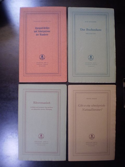Das Konvolut beinhaltet folgende Nummern/Ausgaben: 4: Cecile Ines Loos: Schlafende Prinzessinnen; 8: Konrad Bänninger. Das Korn; 10: Edwin Arnet: Abschied von der Armut; 13: Adolf Koelsch: Hundeballade; 19: Es Blüemli rot und wyss. Schweizerdeutsche Liebes- und Heimatlieder; 20: Hans Boesch: Oleander; 28: Franz Bäschlin: Alpenpass-Heilige und Schutzpatrone der Wanderer; 30: Hans Mohler: Serafino; 32: Arthur Häny: Das Ende des Dichters; 35: Suzanne Oswald: Geist der Humanität. Beitrag zu einem Lebensbild Albert Schweitzers; 36: Adrien Turel: Ergreif das Heute. Gedichte; 38: Albin Zollinger: Kieselsteine; 39: Gotthard Jedlicka: Auf einer Landstrasse; 40: Werner Weber: Augenblicke; 44: Fritz Ernst: Gibt es eine schweizerische Nationalliteratur?; 46: Hermann Hiltbrunner: Mensch im Alltag; 47: Walter Robert Corti: Plan der Akademie; 49: Fritz Enderlin: Horaz. Nachdichtungen; 51: Georg Thürer: Tobel und Brücke; 53: Max Rychner: Das Buchenherz; 55: Othmar Schoeck im Wort; 56: Edwin Arnet: Gedichte des Tagebuchs; 57: Rätoromanisch; 60: Emil Egli: Das Puschlav; 61: Heinz Weder: Klaus Tonau; 63: Peter Lehner: Ausfallstrasse. Gedichte; 64: Gertrud Wilker: Der Drachen. Ein Gespräch; 65: Ruth Elisabeth Kobel: Der neuen Stille sanfte Spur. Gedichte; 66: Raffael Ganz: Piste Imperiale; 67: Ernst Gubler: Briefe; 68: Otto Wirz: Der Eisenbrecher; 70: Susi Bürdeke: Das schmale Boot. Gedichte; 71: René Peter: Die Flucht; 72: Ernst Eggimann: Die Kehrseite. Heraklit; 73: Walter Robert Corti: Acht englische Tage. Einzelpreis: CHF/EUR 20.